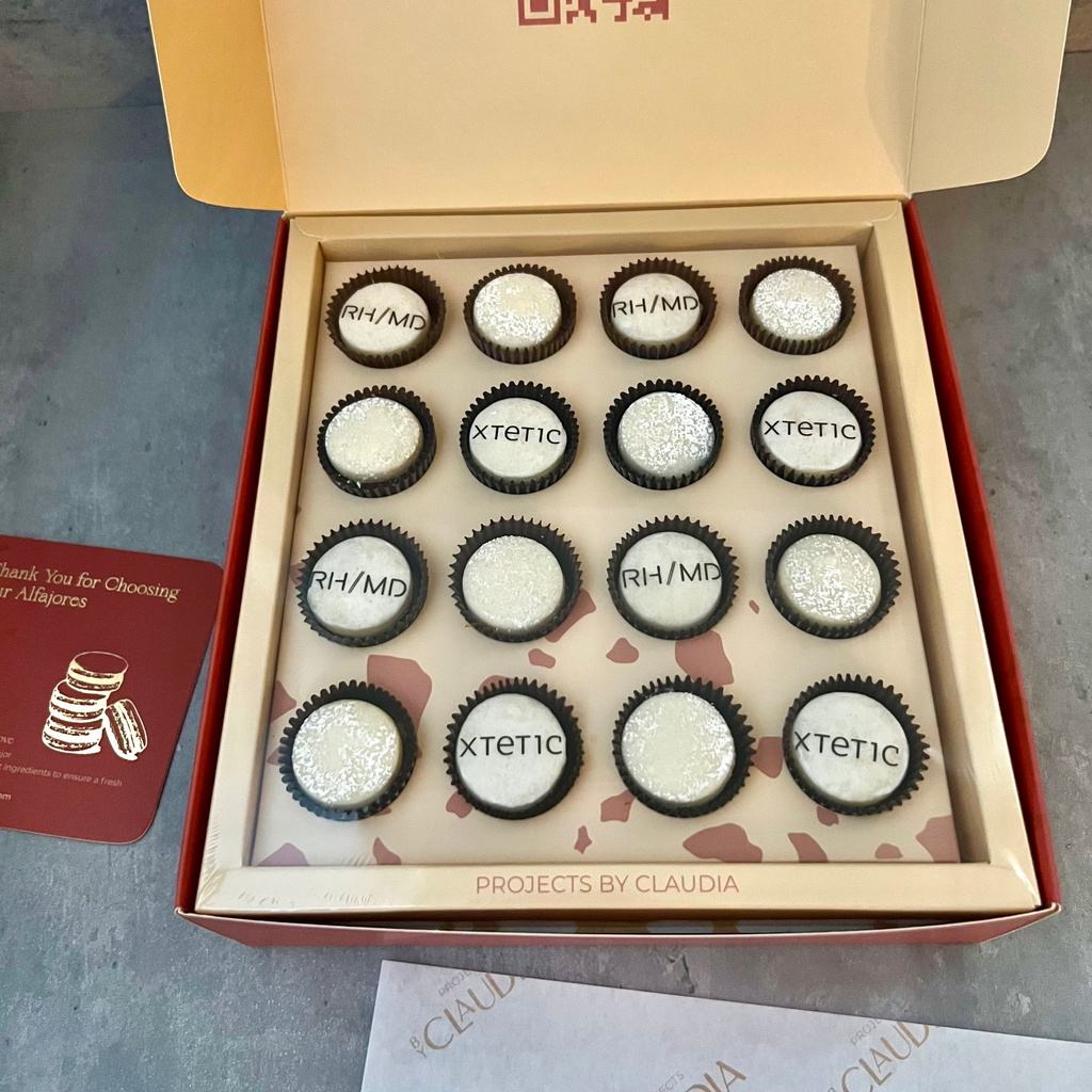 Original alfajores accompanied by personalized alfajores with the image or logo of your choice.