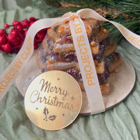 A delicate Christmas tree crafted entirely from soft, crumbly, star-shaped cookie alfajores made with a blend of cornstarch and wheat flour. These cookies are layered with Arequipe (dulce de leche) and ruby pomegranate, then finished with a dusting of powdered sugar.